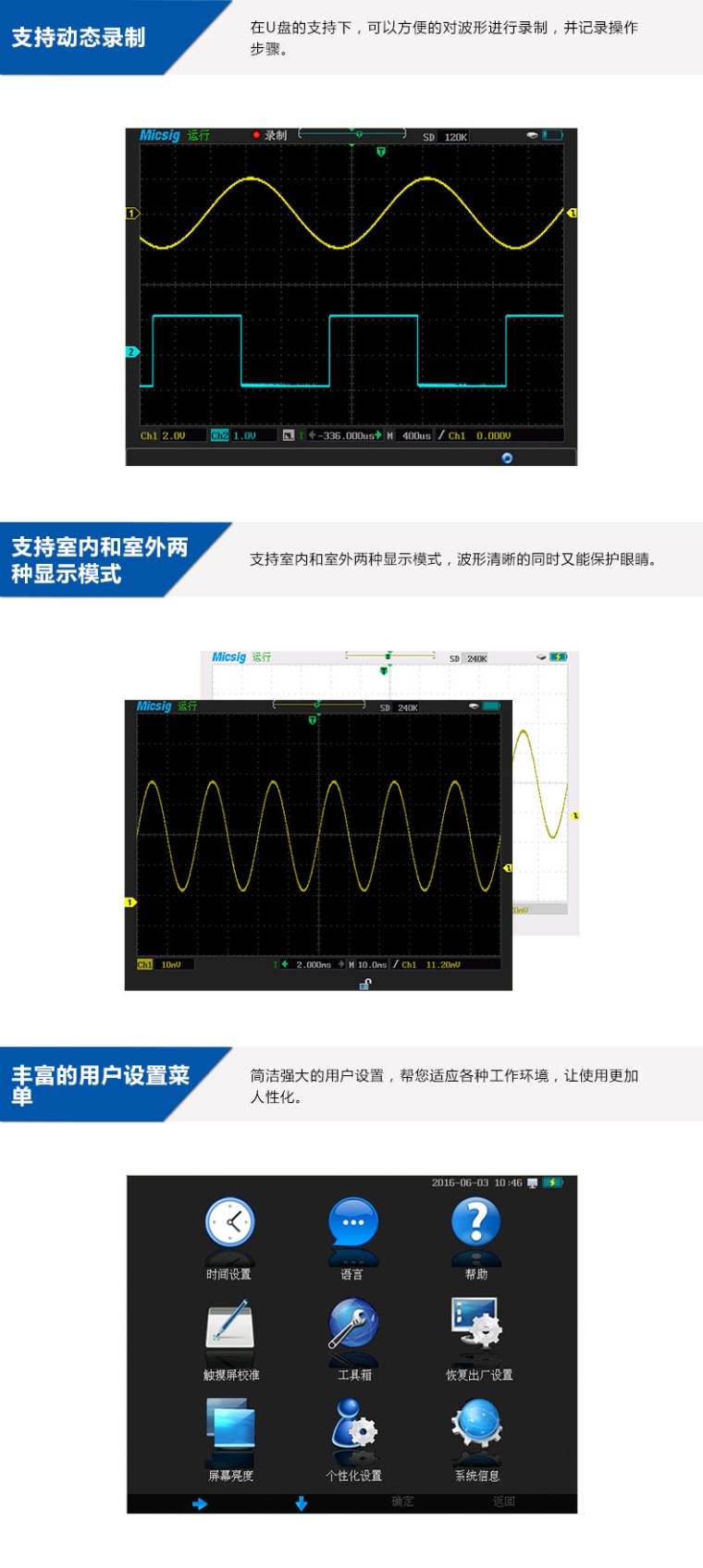 手持示波器MS510S 100MHZ,1GS/S,240Kpts,2-CH,19万次/s,隔离通道,7种总线
