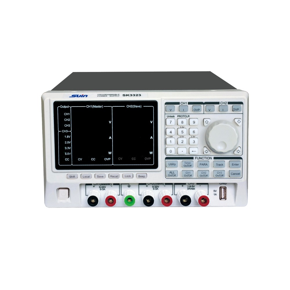 SK3323/SK3325是新一代可程控直流稳定电源。具有USB程控接口,可定时输出规定范围内的任意电压电流值:使用LED显示电源的工作状态:采用大规模集成电路:提供3路电压输出,其中1、2路稳压、稳流值步进可调,稳压稳流两种工作状态可随负载的变化自动转换,1、2路输出可串联、并联、独立工作,第3路提供了可选择的1.8V、2.5V、3.3V、5V四种输出电压,并且提供过载保护。体积小,工作可靠,使用方便。