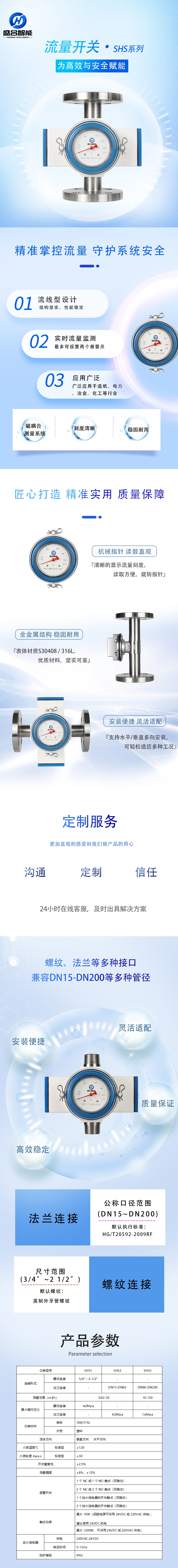 SHS流量开关主要用于管道中的液体流量监测及开关输出,当流量超过或低于设置的预置开关点时,流量开关可以输出一个控制信号,这个预置开关点可以设置在量程中的任意一个位置。SHS流量开关以其坚实的结构和稳定的性能应用于石油、化工、冶金、电力、医药、食品、造纸等行业的发电机、电动机、轧机、压缩机和其它机器的冷却、润滑系统中,起到测量与过程控制的功能。