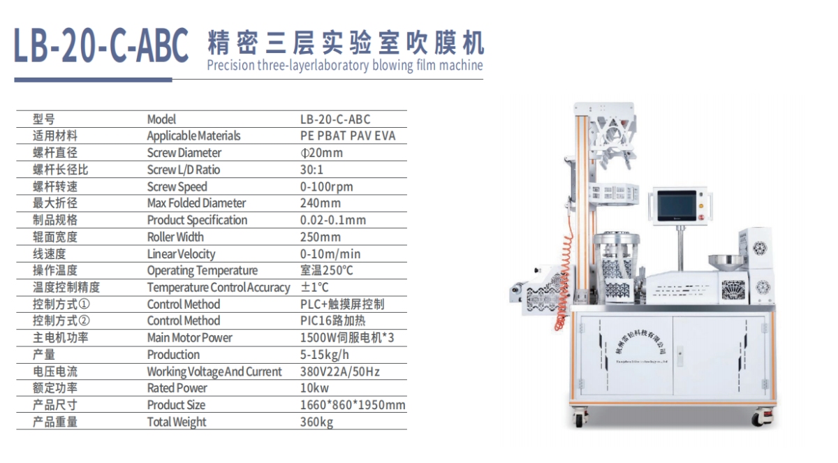 **LB-20-C-ABC 精密三层实验室吹膜机**是一款专为实验室环境设计的高性能吹膜设备,适用于多种材料的薄膜制备,如PE、PBAT、PAV和EVA等。该设备采用三层共挤技术,能够生产厚度范围在0.02-0.1mm的高精度薄膜,折径可达240mm,满足科研和小规模生产的多样化需求。