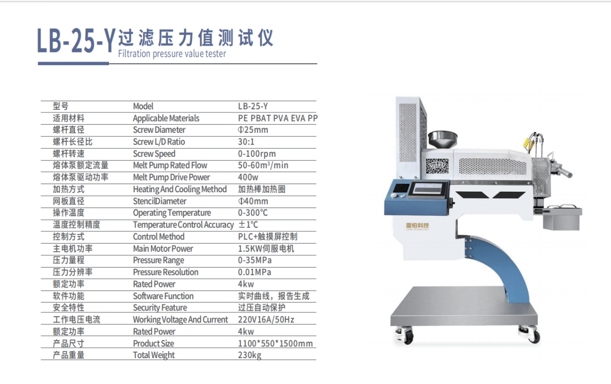 LB-25-Y 是一款专业用于高分子材料(如PE、PBAT、PVA、EVA、PP等)熔体过滤性能测试的高精度实验设备。该仪器采用Φ25mm螺杆,长径比30:1,转速0-100rpm可调,配备熔体泵(额定流量50-60m³/min,驱动功率400W)和Φ40mm网板,可精准模拟材料在高压条件下的过滤特性。其压力量程0-35MPa,分辨率达0.01MPa,支持实时压力曲线显示与报告生成,为研发和质量控制提供可靠数据。