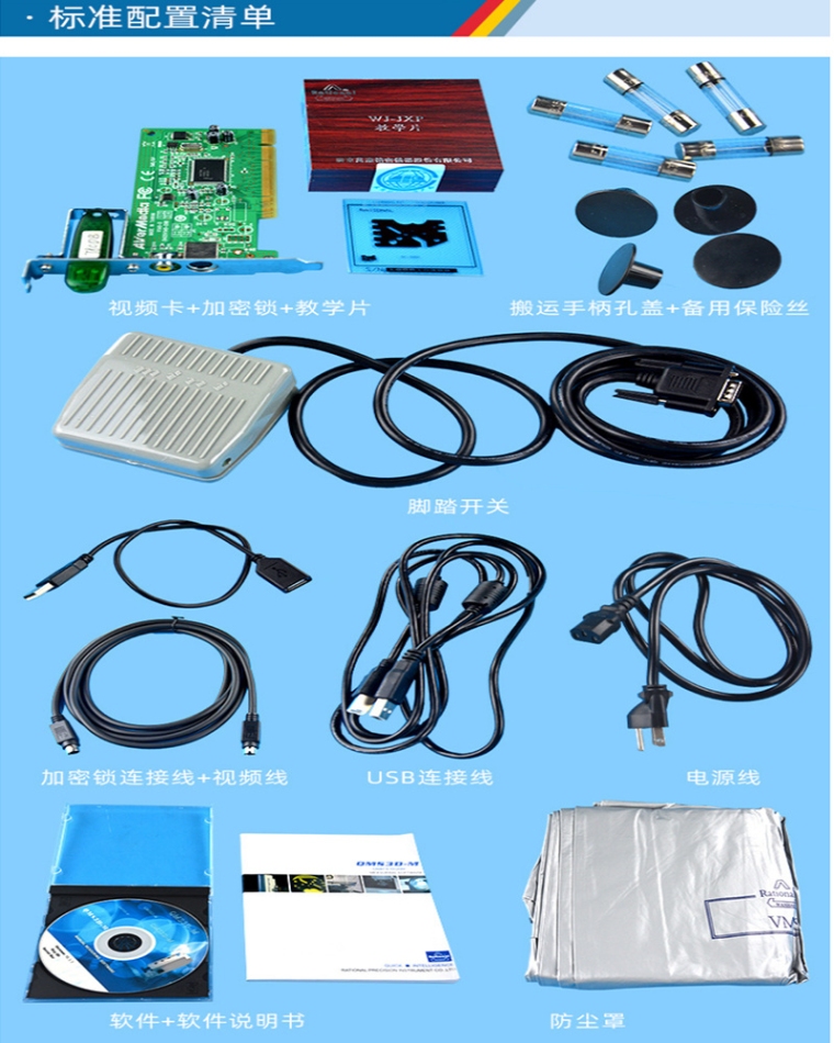 1.自主开发的QMS3D-M软件和高清晰彩色摄像机; 2.软件辅助调光,便于使用者知道光是否过度饱和; 3.可通过激光指示器寻找被测工件的具体位置,可适应复杂的工件测量; 4.可实现高度辅助测量; 5.脚踏开关与软件配合,操作简便。