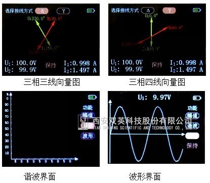 2、2.4寸高分辨率(320*240)真彩色TFT显示,可显示电压和电流真有效值、相位、频率、功率、功率因数等电参数,测量结果以向量图、幅值、相位、功率等多种方式显示。