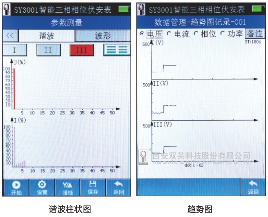 4、可显示三相电压、电流基波幅值、2~50次谐波含有率和柱状图,具有电能质量分析功能;