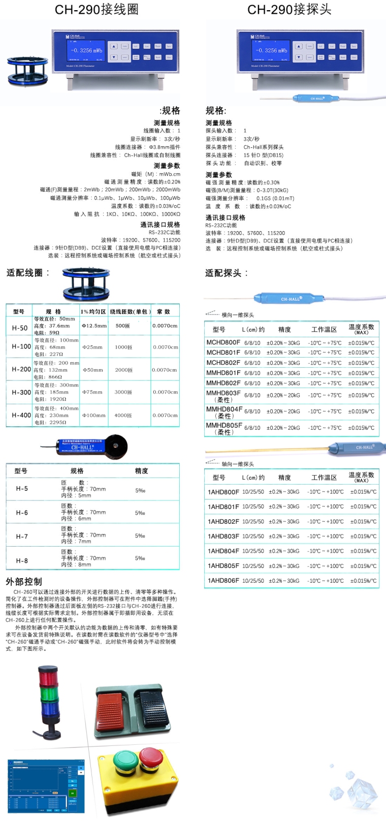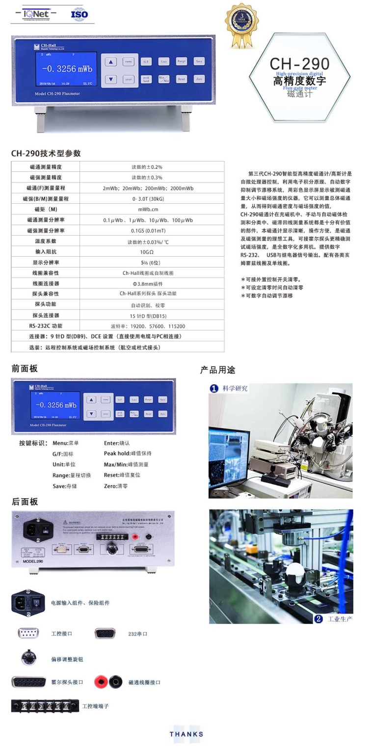 第三代CH-290智能型高精度磁通计/高斯计是由微处理器控制,利用电子积分原理、自动数字抑制调节漂移系统,用彩色显示屏显示被测磁通量大小和磁场强度的仪器,它可以测量总体磁通量,从而得到磁通密度与磁场强度的值,CH-290磁通计在充磁机中、手动与自动磁体检测和分类中、磁滞回线测量系统都是十分有价值的部件,本磁通计显示清晰,操作方便,是磁通及磁强测量的理想工具,可接霍尔探头更精确测试磁场强度,是全数字化多用机。提供数字RS-232、USB与继电器信号判断输出。可以与PLC直接连接,配有各类亥姆霍兹线圈及单线圈。可接外置控制开关清零。