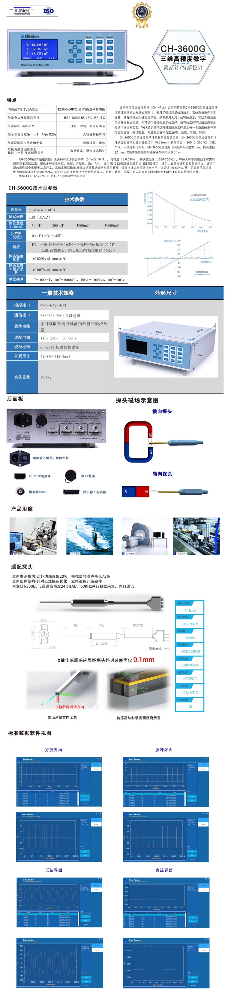 CH-3600G型三通道高斯计主要的特点为高分辨率(0.1mG ,10nT),高精度(±0.05%),探头宽温区(-269-200oC),VGA大屏幕高速显示可实时图形显示测试结果。提供多种显示单位:高斯,特斯拉,Oe,A/m。提供 RS-232/USB通讯接口或IEEE485接口,提供大容量存储和实时数据输出,提供广泛的操作指令集便于二次开发,高精度模拟输出,标配多功能数据分析与绘图软件,性能指标达到国际**水平。它提供(0-60K次/秒)的高速采集功能,优秀的测试重复性被用户公认,目前有几百多台服务于全世界各**,科研,计量,院校,有二百多台24小时服务于APPLE公司磁检测生产线。
