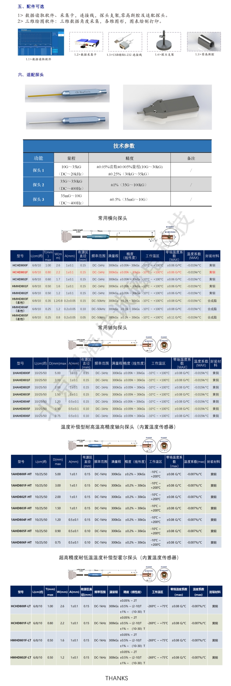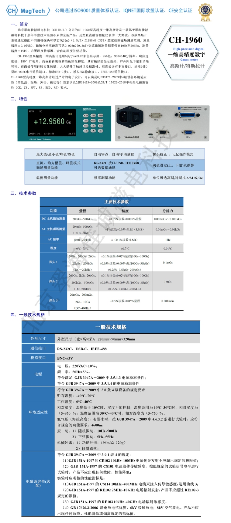CH-1960型高精度一维高斯计是一款基于公司十余年丰富技术经验积累的全新研发成果,是交直流磁场测量仪表的又一重大突破。该款高斯计主机通过搭配不同规格探头可以实现1mG(100nT)至350kG(35T)超宽范围磁场测量范围,测量精度最高可达±0.05%RD,磁场分辨率最高可达0.001mG(0.1nT)交流磁场测量频率带宽1Hz至20kHz,测量精度±1%RD,内置温度传感器,含自动温度补偿功能。