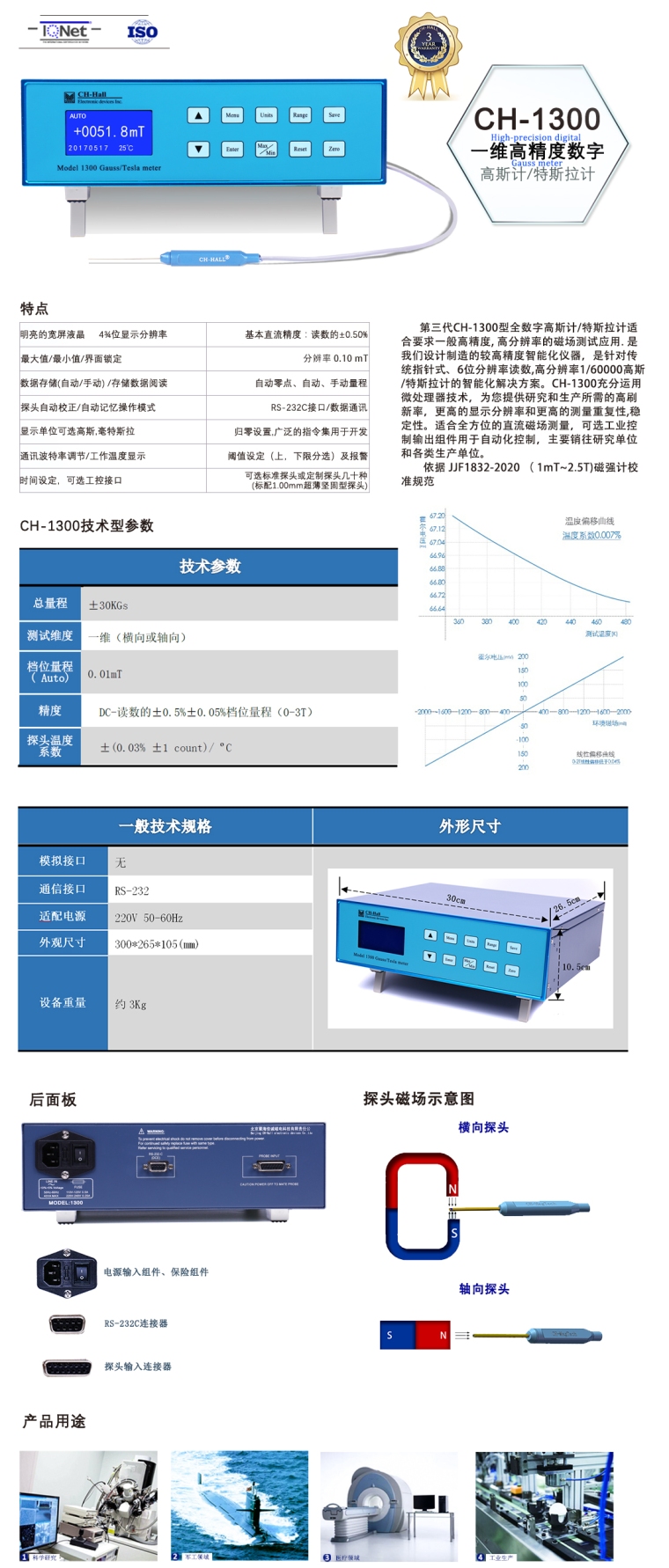 第三代CH-1300型全数字高斯计/特斯拉计适合要求一般高精度, 高分辨率的磁场测试应用. 是我们设计制造的较高精度智能化仪器,是针对传统指针式、6位分辨率读数,高分辨率1/60000高斯/特斯拉计的智能化解决方案。CH-1300充分运用微处理器技术,为您提供研究和生产所需的高刷新率,更高的显示分辨率和更高的测量重复性,稳定性。适合全方位的直流磁场测量,可选工业控制输出组件用于自动化控制,主要销往研究单位和各类生产单位。
