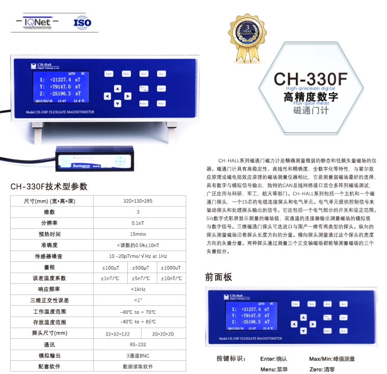 CH-HALL系列磁通门计是精确测量微弱的静态和低频矢量磁场的仪器。磁通门计具有高稳定性、高线性和精确度,全数字化等特性,与霍尔效应原理或磁电阻效应原理的磁场测量仪器相比,它是测量弱磁场***选择,具有数字与模拟信号输出,独特的CAN总线网络接口适合多阵列磁场测试,广泛应用与科研,**,航天等部门。