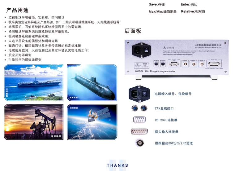 CH-HALL系列磁通门计是精确测量微弱的静态和低频矢量磁场的仪器。磁通门计具有高稳定性、高线性和精确度,全数字化等特性,与霍尔效应原理或磁电阻效应原理的磁场测量仪器相比,它是测量弱磁场***选择,具有数字与模拟信号输出,独特的CAN总线网络接口适合多阵列磁场测试,广泛应用与科研,**,航天等部门。