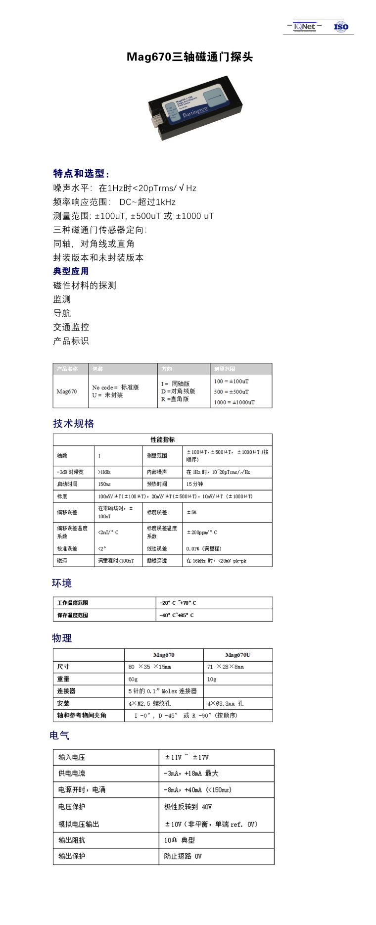 噪声水平:在1Hz时<20ptrms>频率响应范围:DC~超过1kHz测量范围:±100uT,+500uT或±1000 uT