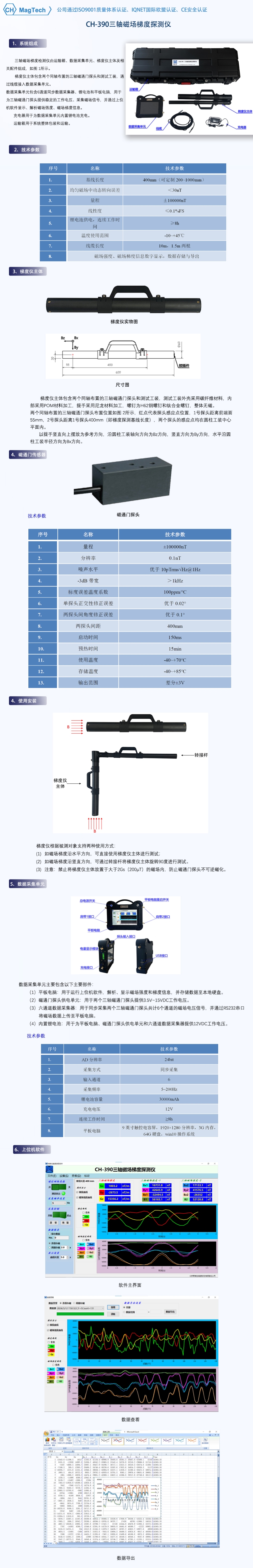 数据采集单元包含6通道同步数据采集器、锂电池和平板电脑,用于为三轴磁通门探头提供稳定的工作电压、采集磁场信号,并通过上位机软件显示、解析磁场强度、磁场梯度信息。