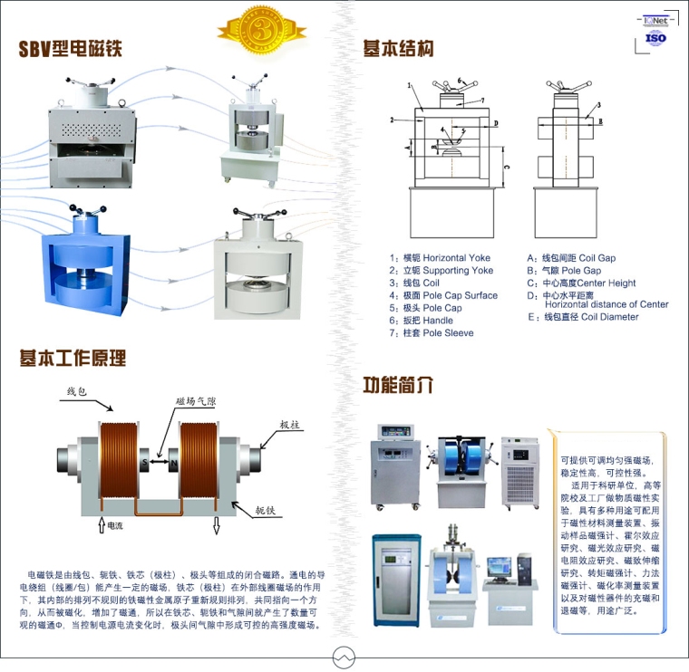 磁场气隙单向可调,双轭构形成闭合磁路,有较好的刚性,磁场方向垂直;直立座放,样品可置于下极头平面上,取放样品方便。适用于霍尔效应研究,磁电阻效应研究、磁滞伸缩研究、转矩磁强计、力法磁强计、磁化率测量装置、磁性材料测量装置以及对磁性器件的充磁和退磁等。