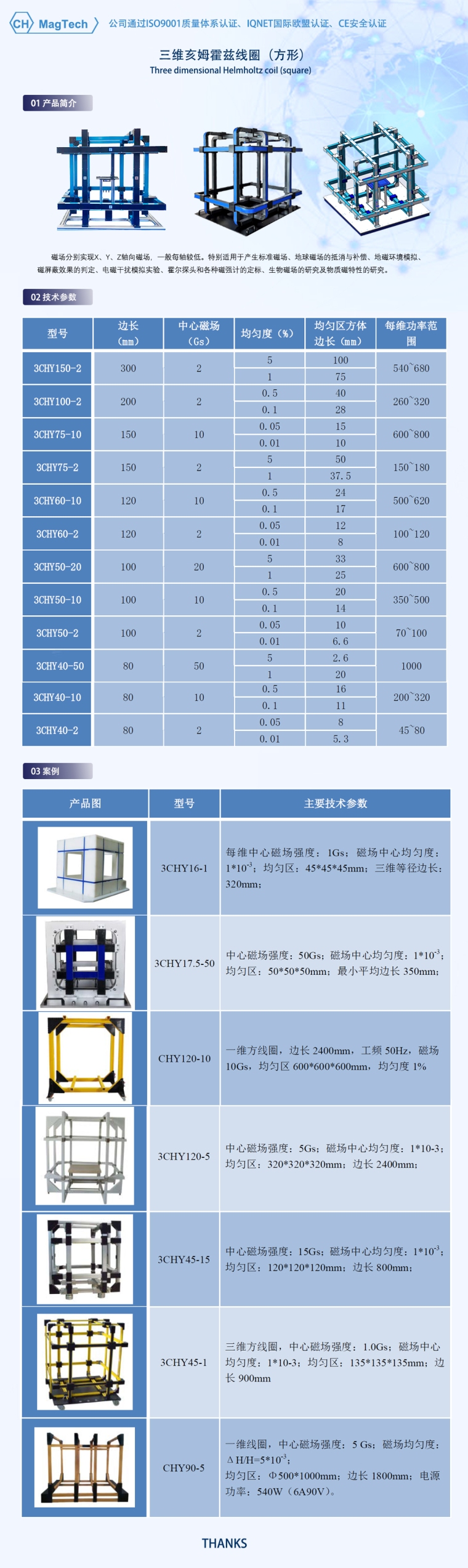 磁场分别实现X、Y、Z轴向磁场,一般每轴较低。特别适用于产生标准磁场、地球磁场的抵消与补偿、地磁环境模拟、磁屏蔽效果的判定、电磁干扰模拟实验、霍尔探头和各种磁强计的定标、生物磁场的研究及物质磁特性的研究。