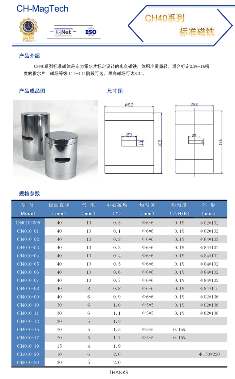 CH40系列标准磁体是专为霍尔片标定设计的**磁铁,体积小重量轻,适合标定0.1%~1%精度的霍尔片,磁场等级0.1T~1.1T阶段可选。最高磁场可达3.0T。