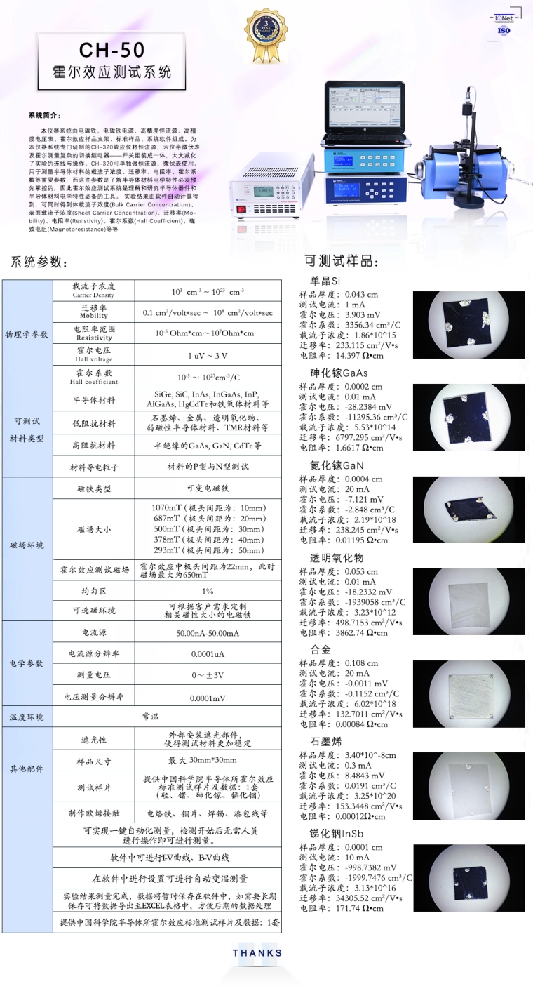 本仪器系统由电磁铁、连接电缆、高精度恒流源、高精度电压表、霍耳探头、标准样品、样品安装架、系统软件组成。为本仪器系统专门研制的CH-320效应仪将恒流源,六位半微伏表及霍耳测量复杂的切矩阵开关组装成一体,大大减化了实验的连线与操作。CH-320可单独做恒流源、微伏表使用。用于测量半导体材料的载流子浓度、迁移率、电阻率、霍尔系数等重要参数,而这些参数是了解半导体材料电学特性必须预先掌控的,因此霍尔效应测试系统是理解和研究半导体器件和半导体材料电学特性必备的工具。 实验结果由软件自动计算得到,可同时得到体载流子浓度(Bulk Carrier Concentration)、表面载流子浓度(Sheet Carrier Concentration)、迁移率(Mobility)、电阻率(Resistivity)、霍尔系数(Hall Coefficient)、磁致电阻(Magnetoresistance)等等。