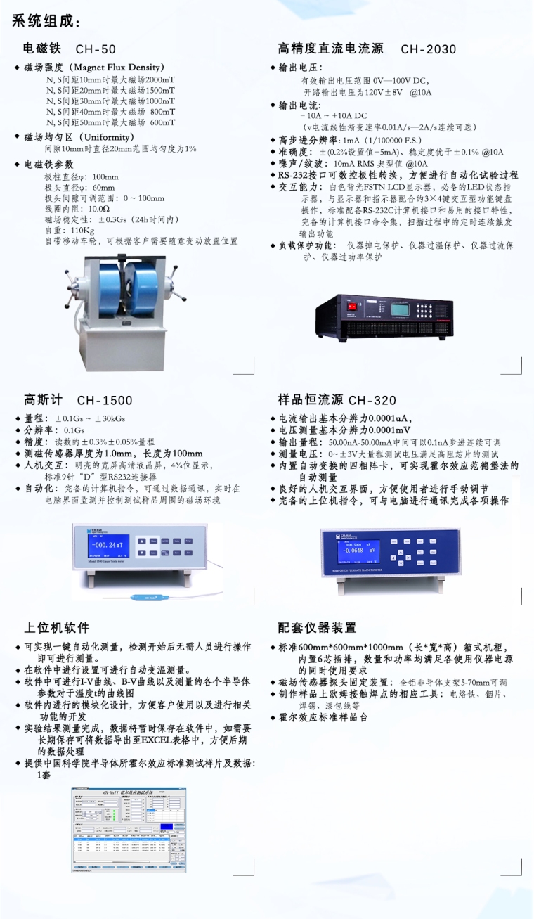 本仪器系统由可换向电磁铁、电磁铁电源、高精度恒流源、高精度电压表、霍尔效应样品支架、标准样品、系统软件组成。为本仪器系统专门研制的CH-320效应仪将恒流源,六位半微伏表及霍尔测量复杂的切换继电器——开关组装成一体,大大减化了实验的连线与操作。CH-320可单独做恒流源、微伏表使用。用于测量半导体材料的载流子浓度、迁移率、电阻率、霍尔系数等重要参数,而这些参数是了解半导体材料电学特性必须预先掌控的,因此霍尔效应测试系统是理解和研究半导体器件和半导体材料电学特性必备的工具。 实验结果由软件自动计算得到,可同时得到体载流子浓度(Bulk Carrier Concentration)、表面载流子浓度(Sheet Carrier Concentration)、迁移率(Mobility)、电阻率(Resistivity)、霍尔系数(Hall Coefficient)、磁致电阻(Magnetoresistance)等等。