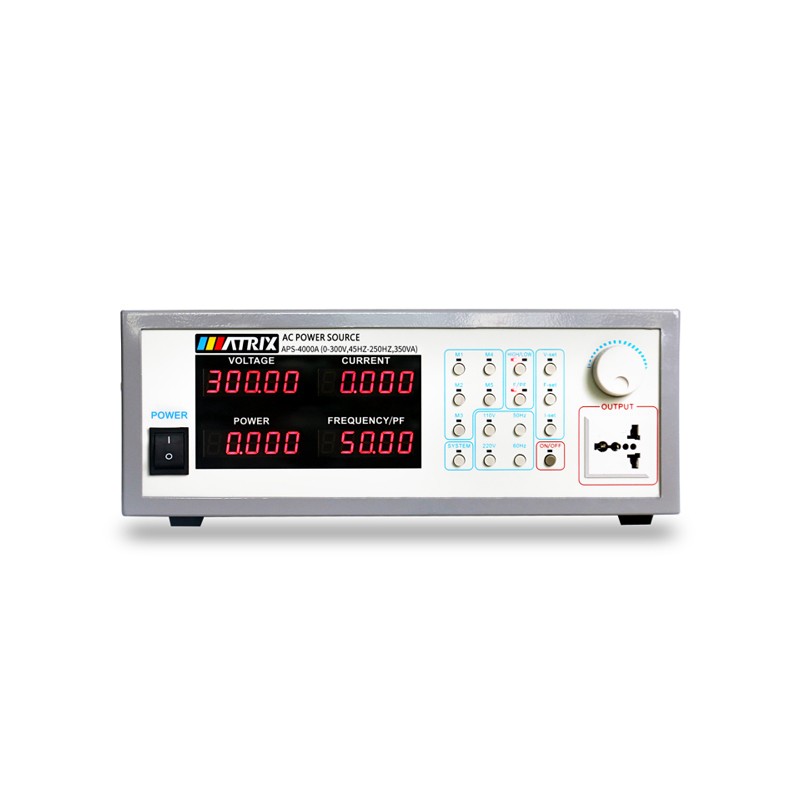 APS4000系列是350VA到1200VA的交流电源,输出频率:45Hz-250Hz连续可调(特殊频率可定制); 输出相电压:耐1V-150VAC,高档151V-300VAC,自动档1V-300V。