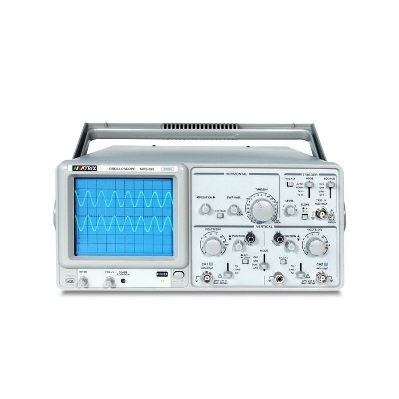 MOS-6XXC系列双踪示波器,最大灵敏度为5mV/div,最大扫描速度为0.2us/div,并可扩展10倍使扫描速度达到 20ns/div。该示波器采用6英时并带有刻度的矩形CRT,操作简单,稳定可靠。