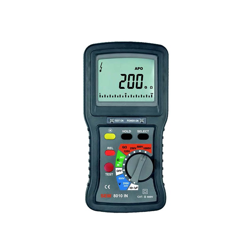 ●具有六种功能:量测绝缘阻抗(GΩ)、交流/直流电压、电阻值、导通测试(Ω)、电容值六种功能