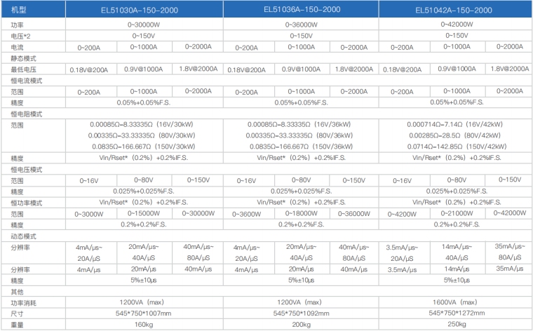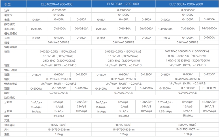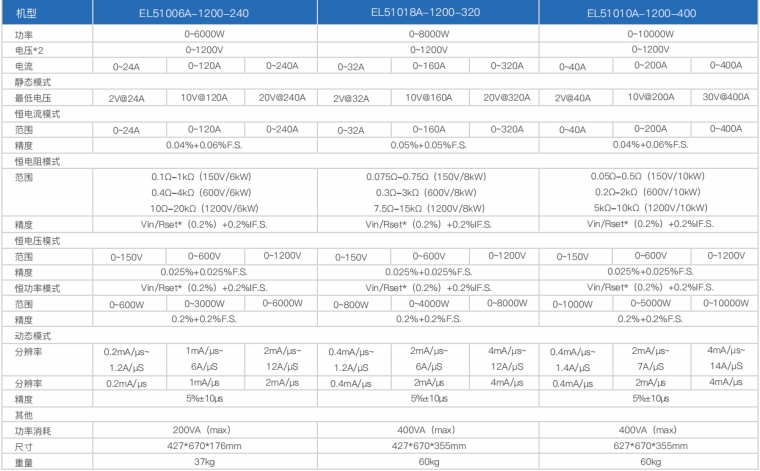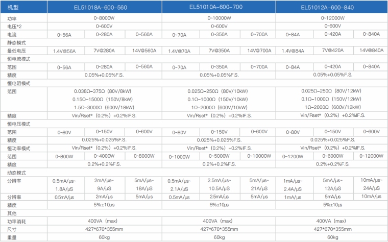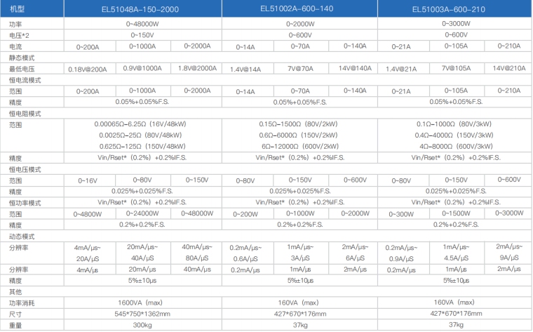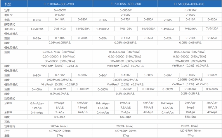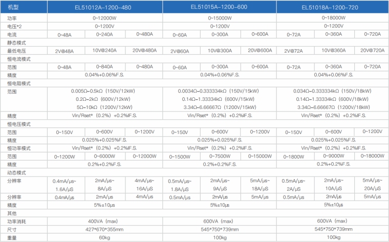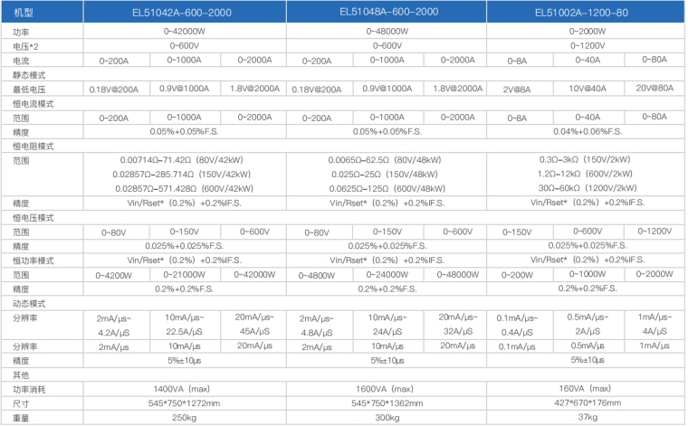 EL51000A系列负载具有高功率密度、高控制和测量精度、高性价比“三高”特点;同时本系列负载具备同步动态,并联扩展等功能,更有瞬间提供三倍额定功率功能,EL51000A系列负载支持恒电压CV、恒电流CC、恒电阻CR、恒功率CP四种传统静态加载模式,更支持恒电压CV+恒电流CC、恒电阻CR+恒电流CC、恒电压CV+恒电阻CR三种复合加载模式。
