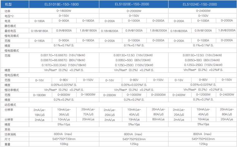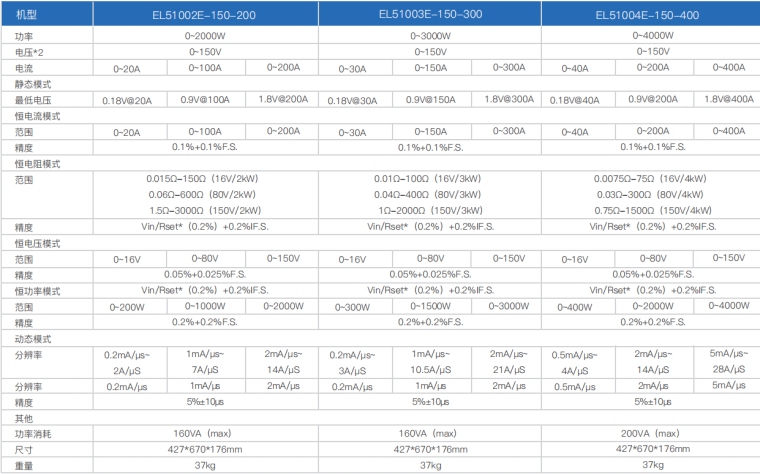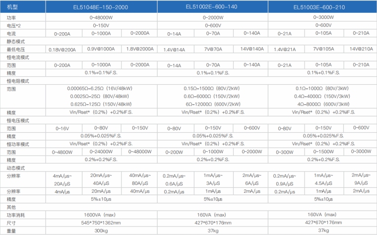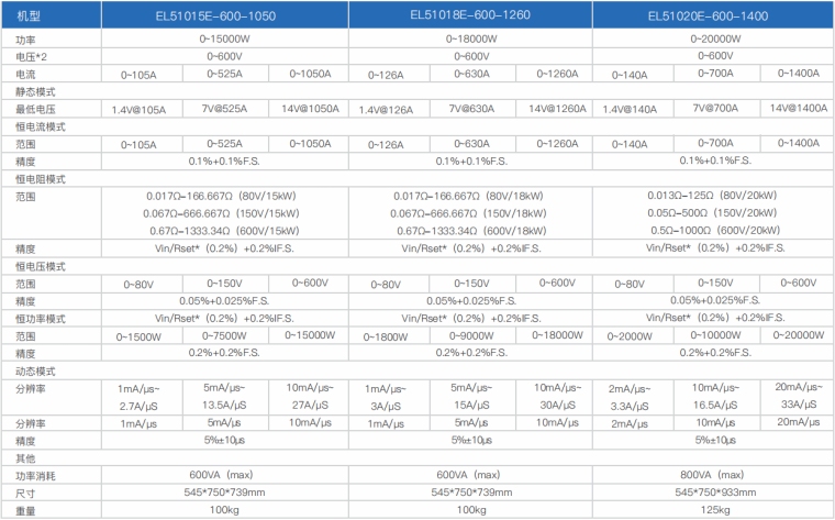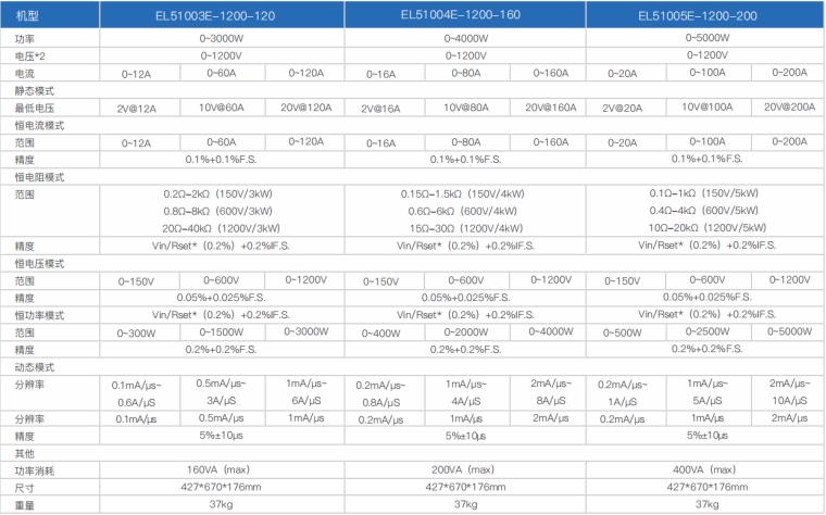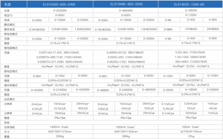 EL51000E系列负载具有高功率密度、高控制和测量精度、高性价比“三高”特点;同时本系列负载具备同步动态,并联扩展等功能,更有瞬间提供三倍额定功率功能,EL51000E系列负载支持恒电压CV、恒电流CC、恒电阻CR、恒功率CP四种传统静态加载模式,更支持恒电压CV+恒电流CC、恒电阻CR+恒电流CC、恒电压CV+恒电阻CR三种复合加载模式。