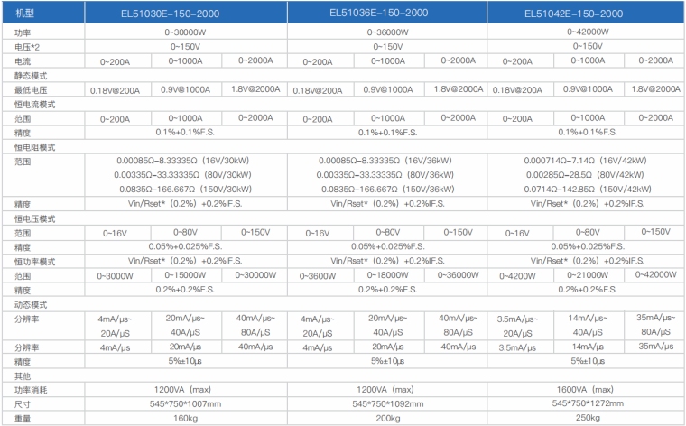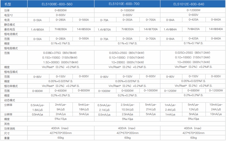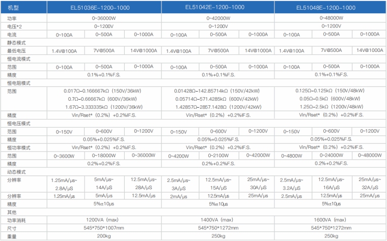 EL51000E系列大功率电子负载有150V、600V、1200V三种电压范围,功率范围由2kW至48kW、单一台的最大电流可达2000A;通过并联扩展,最大功率更可达240kW。