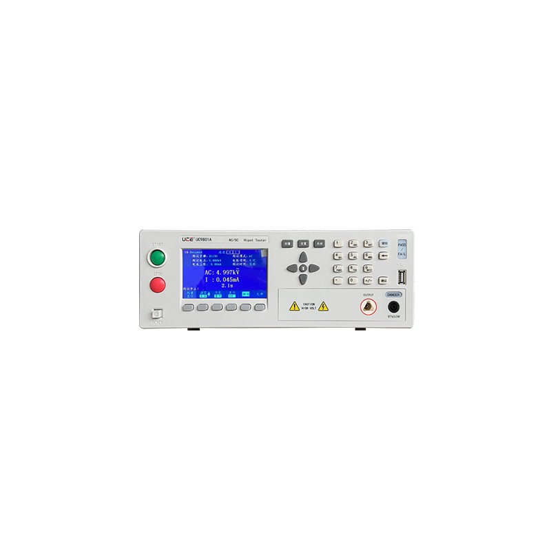 UC9801系列程控安规测试仪,具有交流耐压测试、直流耐压测试、绝缘电阻测试功能。同时具有电弧侦测功能。具有3组测试模式,可实现可编程测试。可选配RS485接口,通过MODBUS通讯协议可以轻松实现仪器组网。