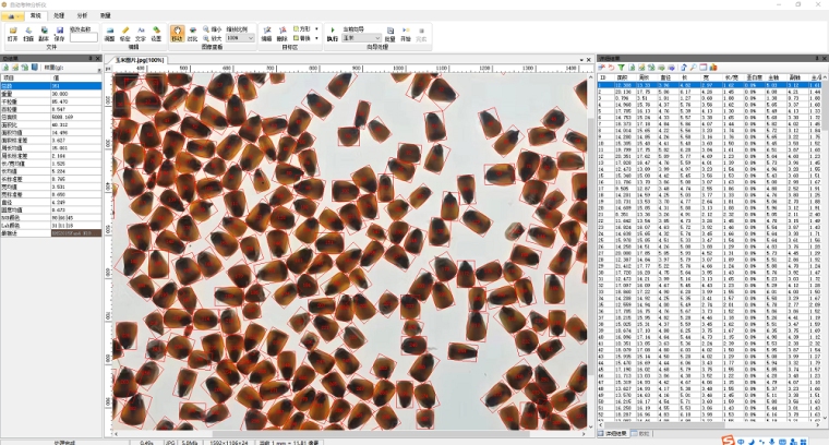5、能自动测出各类粘连种粒的每粒粒形参数(长、宽、长宽比、面积、等效直径、周长等),能精准显示种粒外接矩形,并可自动排序输出,及可输出粒径分布图表。
