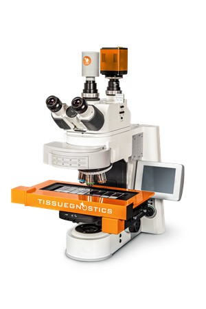 TissueFAXS组织原位单细胞空间表型验证定量系统结合了流式散点图分析与图像原位信息,提供单细胞级别定量数据及组织结构定量分析,支持明场和荧光双独立光路,具备Z-stack扫描和全倍率物镜扫描等功能,兼容多种玻片尺寸,具有AI自学习对焦算法和智能TMA block扫描识别功能。该系统还支持IF-IHC图像互相转换,自动识别细胞核/质/膜染色通道,并能识别上皮细胞/间质区域等结构,可用于HE染色样本的细胞-组织结构识别,提高样本分析效率和精度。同时,它具备正反向回溯功能,确保数据分析的准确性,支持细胞群圈选统计和细胞表型原位共表达分析。