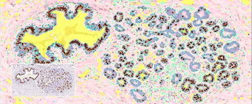 2. 利用特异性染色及组织特征,识别上皮细胞/间质区域/空腔等结构,对肿瘤/腺体/胶原增生等组织类型进行识别及定量分析。
