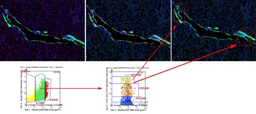 组织流式定量分析技术赋予每个细胞多个分析参数,配合Gate和Input Gate功能,可供使用者筛选特定的感兴趣细胞亚群。利用 Gate 工具根据细胞核大小、染色强度差异能够准确筛选出有消息报,并且排除粘连细胞和细胞碎片(左侧散点图)。新建散点图仅分析有效细胞(右侧散点图),利用 Gate 可进一步将有效细胞划分成不同 marker 表达强度群体,简单实现marker 表达强度准确统计。