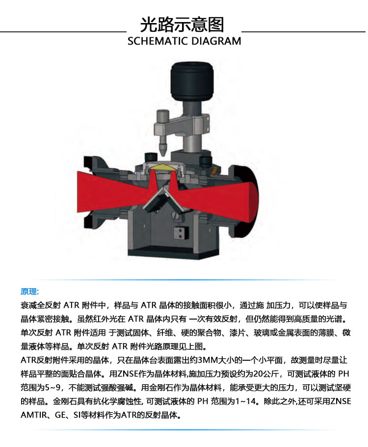 ATR附件基于光内反射原理而设计。从光源发出的红外光经过折射率大的晶体再