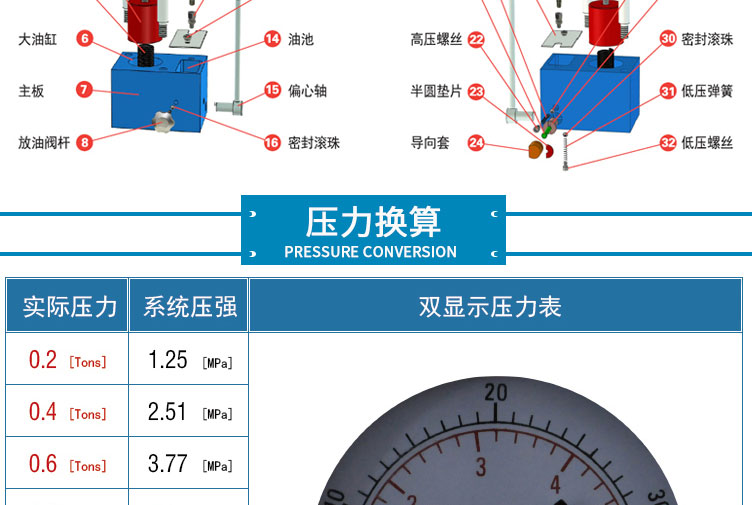 压力表 压力吨位(T)/压强兆帕(Mpa)双刻度显示