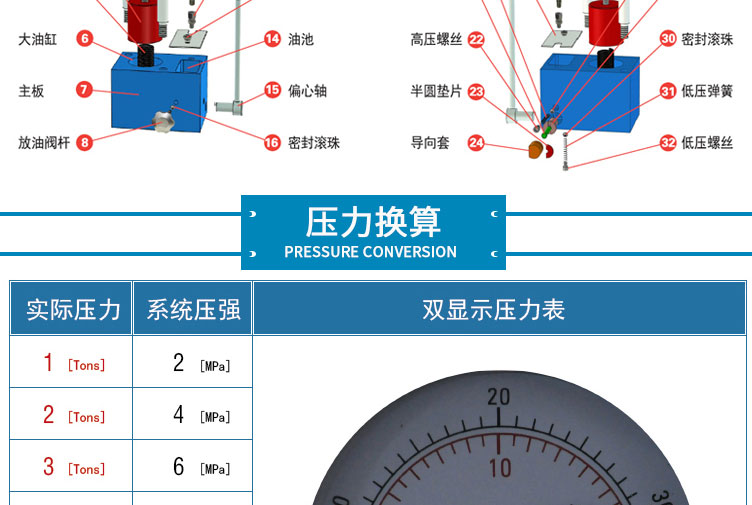 压力表 压力吨位(T)/压强兆帕(Mpa)双刻度显示