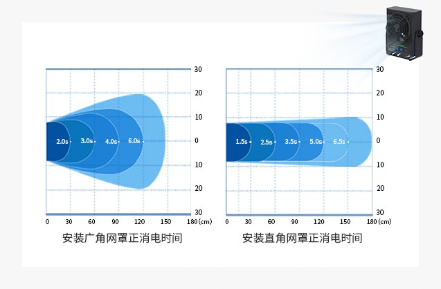 采用可换式网罩设计,适配不同工业场景需求 广角导流网罩:通过环形导流板技术,将离子扩散角度提升40%;定向增压网罩:结合渐变式扩风结构,使离子风集中喷射,最远输送距离达3米,静电消除速度提高50%。 |