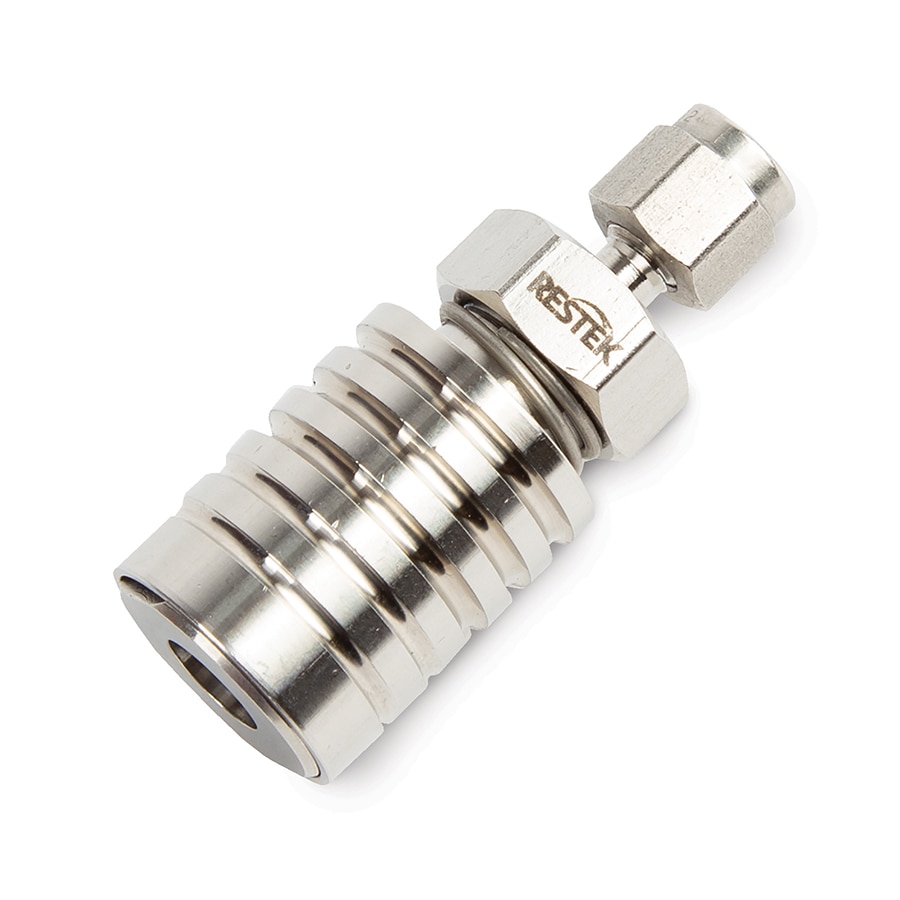Note: A RAVEqc valve bracket is required for use with Restek 1, 3, 6, and 15 L air sampling canisters when using the compression fitting mounted directly on the 1/4" canister tube stub. This bracket is not needed when using Restek miniature canisters or Entech canisters.