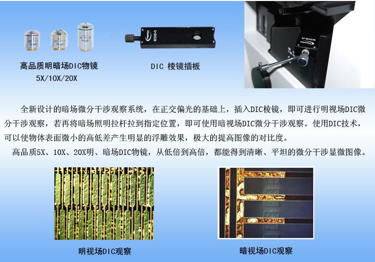 | 物镜 (配备明/暗场微分干涉物镜) | 无限远长距平场消色差物镜(无盖玻片) |
