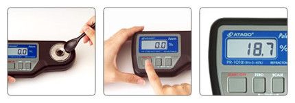 滴少量样品至棱镜槽→按键START / OFF →测量数值在3次闪烁后→自动显示Brix值(浓度)。