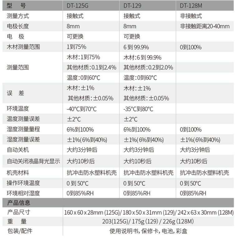 DT-128M非接触式水分测试仪做工精细,手持式测量非常方便;采用先进的碳化方法测量湿度,仪表性能稳定可靠;测量结果准确,即使细微水分变化也能体现;是木制品、石膏板、水泥等建材产品水分含量检测的佳选