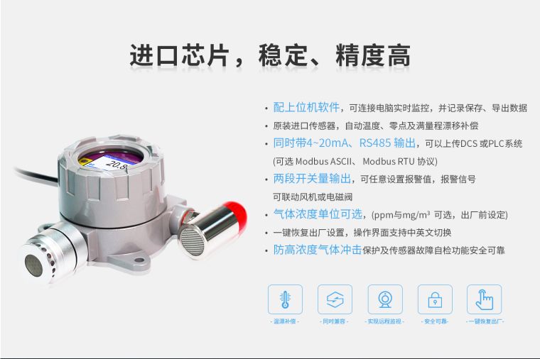 ◆ 原装进口传感器,两级声光报警,中英文切换。
