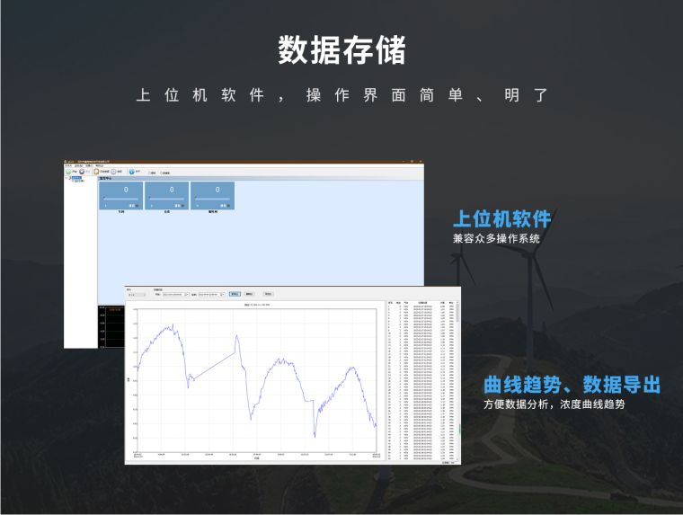 ◆ 配上位机软件,可连接电脑实时监控,并记录存储、导出数据。