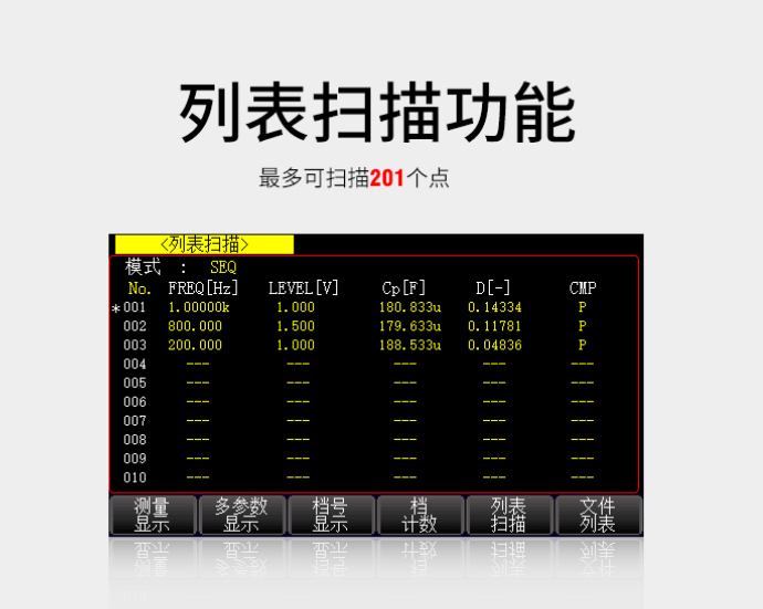 列表扫描 | 201 点,扫描参数:测试频率、AC 电压、AC 电流、DC BIAS 电压、DC BIAS 电流 |