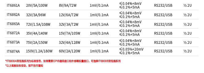 IT6800A系列双范围可编程直流电源(72-180W),每台电源具有两个电压、电流输出范围,一台电源可以当两台使用,极大节约使用者的成本和空间。具有1mV / 0.1mA的高分辨率。同时支持面板List编程和通过计算机进行软件操作,满足更多的通讯需求。适用于实验室测试、产在线生产测试、维修检测等