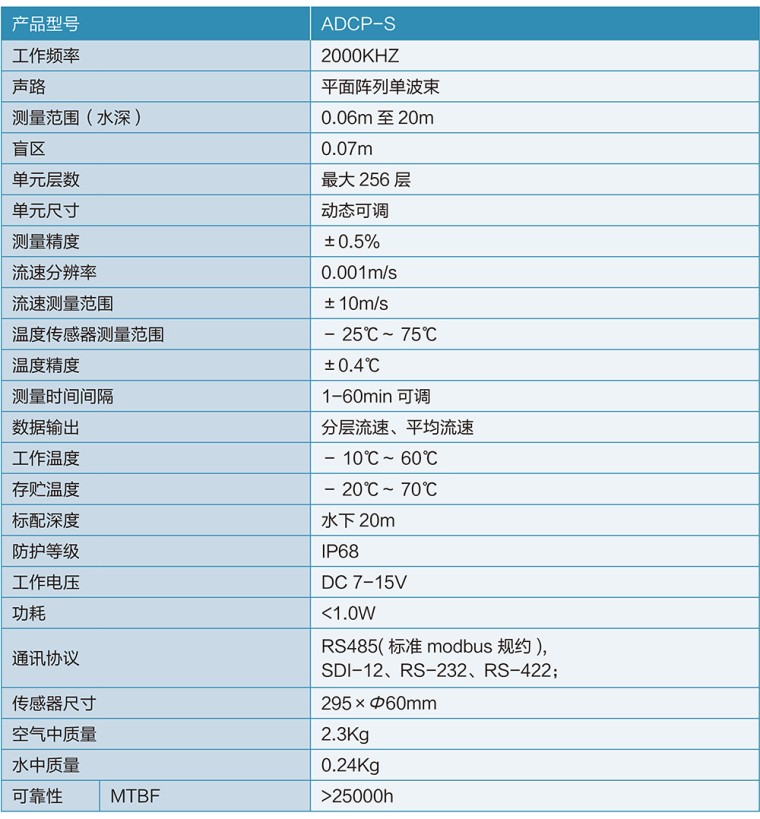 ADCP-S系列成为功能强大的测流系统。采集高质量的水平剖面数据。采用坐底的安装方式,借助于智能声波脉冲功能,即使水流条件发生变化,仍然可以获得高分辨率和高质量的流速数据。特别适用于: 天然河流、小溪。