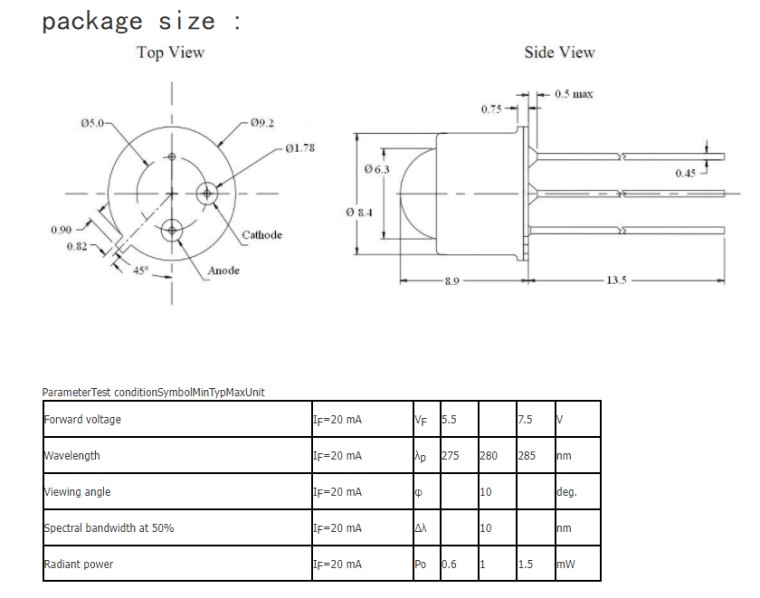 产品别名:285nm 280nm LED发光二极管